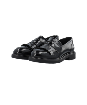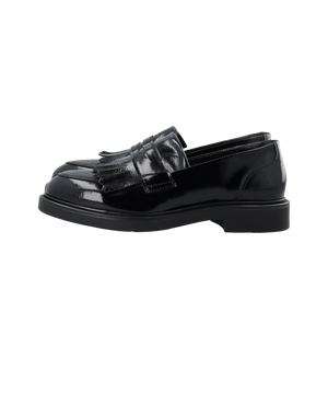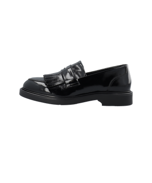 Opgrader din garderobe med denne elegante sorte loafer, der kombinerer klassisk design med moderne komfort. Skoen er udført i blødt laklæder fra et LWG-certificeret garveri, hvilket sikrer både høj kvalitet og ansvarlig produktion. De dekorative frynser tilfører et sofistikeret udtryk, der gør skoen perfekt til både kontorbrug og stilfulde hverdagslooks.