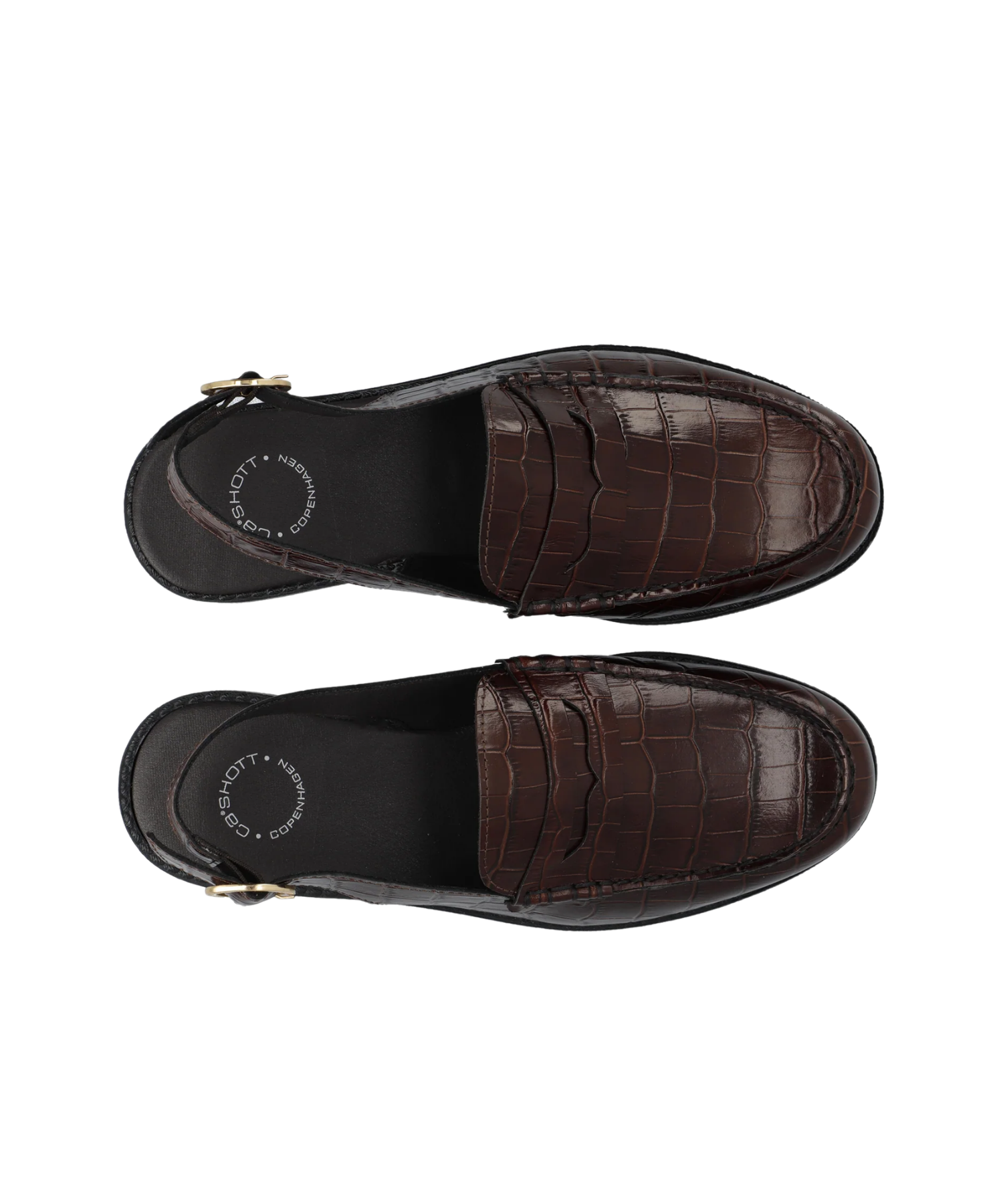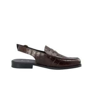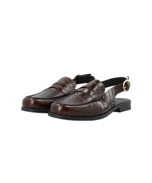Opgrader din garderobe med disse elegante Cashott slingback loafers i mørkebrunt croco-præget læder. Skoen kombinerer det klassiske loafer-design med en moderne slingback-silhuet, der giver et let og sofistikeret udtryk – perfekt til både hverdag og sommerlige anledninger.