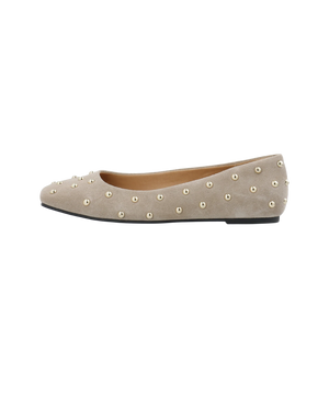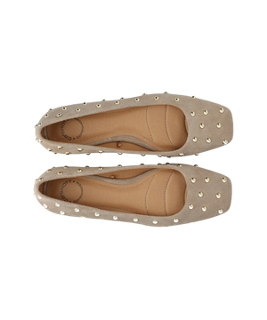Opdag en stilren og komfortabel ballerina i blødt ruskind, designet til både hverdag og arbejde. Den moderne firkantede tå og de dekorative nitter giver skoen et elegant og feminint udtryk, mens den neutrale mushroom-farve gør den nem at style med alt fra jeans til kjoler og klassiske kontorsæt.