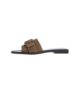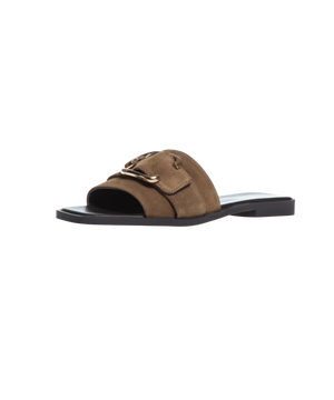 Den tan-farvede nuance giver et naturligt og tidløst look, som nemt kan styles sæson efter sæson. Ruskindets bløde struktur skaber et luksuriøst udtryk, mens den brede rem sikrer en flot og behagelig pasform. Den gyldne spænde understreger sandalens elegante design og giver et feminint finish.