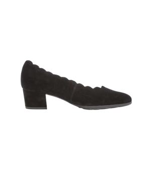 Den bløde overflade i ægte ruskind giver pumpen et sofistikeret udtryk, mens den sorte farve gør dem lette at style med alt fra business-outfits til kjoler. Med en ekstra vidde (vidde G) får du mere plads i forfoden, hvilket sikrer en behagelig pasform – selv på lange dage.