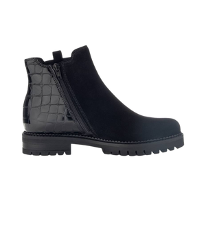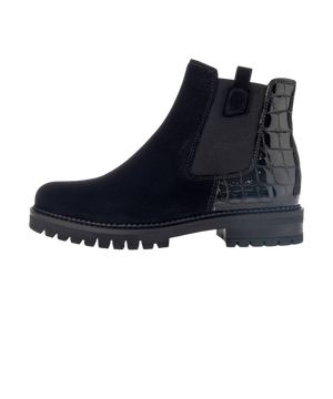 Dame støvle i sort med ruskind, lak og krokomønster