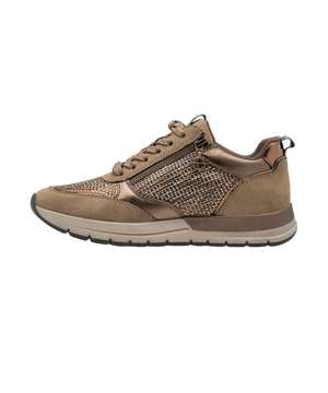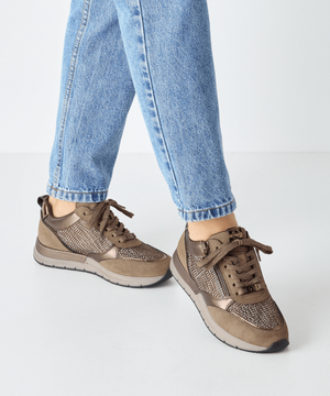 Sneakeren har et elegant lavt snit og en rund snude, hvilket sikrer en tidløs pasform, mens de kobberfarvede og let glitrende detaljer tilfører et eksklusivt touch til dit look. Overdelen er fremstillet i en blanding af tekstil og syntetisk materiale – helt uden animalske komponenter – hvilket gør skoen til et ansvarligt valg for den miljøbevidste kvinde.