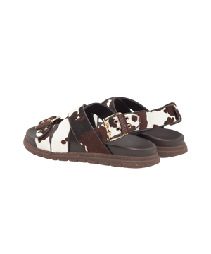 Bemærk: Da produktet er fremstillet af ægte læder med naturlige hår, kan enkelte hår med tiden løsne sig uden at det påvirker sandalens holdbarhed eller kvalitet.